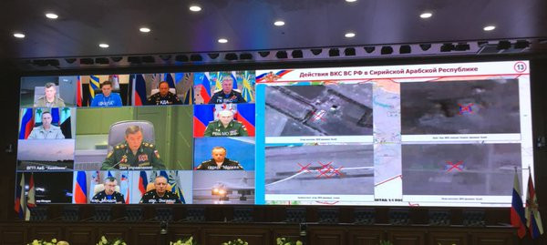 Trên màn hình khổng lồ cho thấy các hoạt động tác chiến ở Syria, các phương tiện chiến đấu tấn công các mục tiêu.