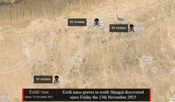 Tại miền bắc Iraq, gần thị trấn Sinjar mới được giải phóng khỏi IS, đã tìm thấy ba ngôi mộ Yezidis chôn người tập thế. Tổng số, tìm thấy hài cốt của ít nhất 190 người.