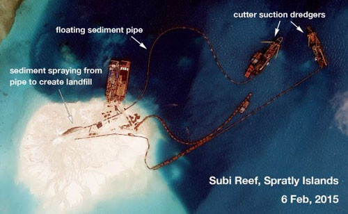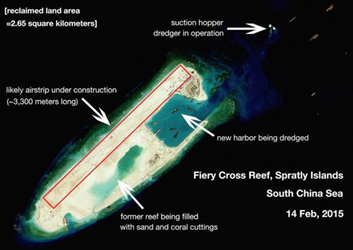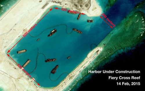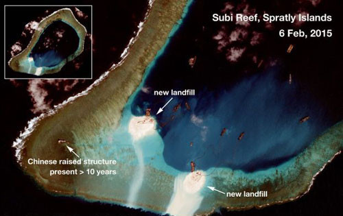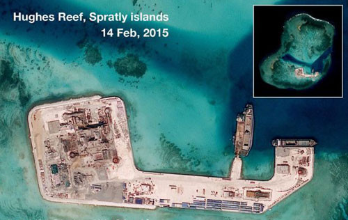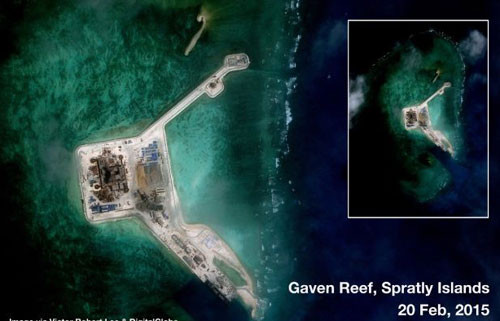 Hình ảnh vệ tinh ngày 16/3 cho thấy một đảo nhân tạo được xây dựng trên Đá Vành Khăn