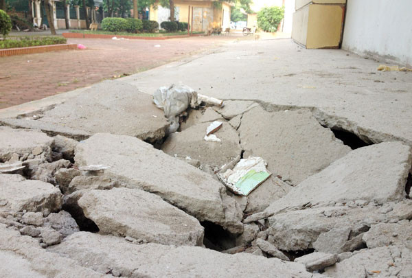 Sụt lún nghiêm trọng ở nhà NƠ 6 Khu đô thị Pháp Vân - Tứ Hiệp đã nhiều tháng không được sửa chữa.