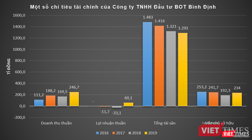 Dữ liệu của VietTimes cho thấy, năm 2019, BOT Bình Định ghi nhận doanh thu thuần đạt 246,7 tỉ đồng, báo lãi thuần ở mức 60,1 tỉ đồng, tương ứng với biên lợi nhuận 24% - tức cứ khoảng 4 đồng doanh thu, BOT Bình Định lại thu về 1 đồng lợi nhuận.