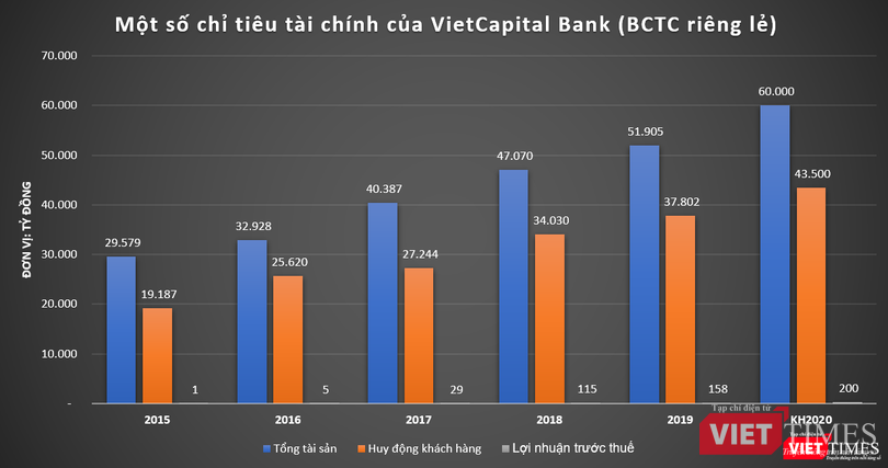 Năm 2020, VietCapital Bank đặt mục tiêu tăng quy mô tài sản thêm 16%, đạt mức 60.000 tỷ đồng. Nguồn vốn huy động đạt trên 43.500 tỷ đồng, tăng 15% so với năm 2019. Nhà băng này đạt mục tiêu lợi nhuận trước thuế riêng lẻ đạt 200 tỷ đồng, tăng 27% so với năm 2019.