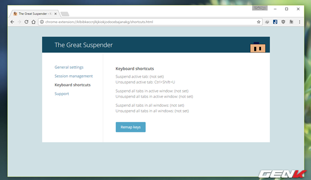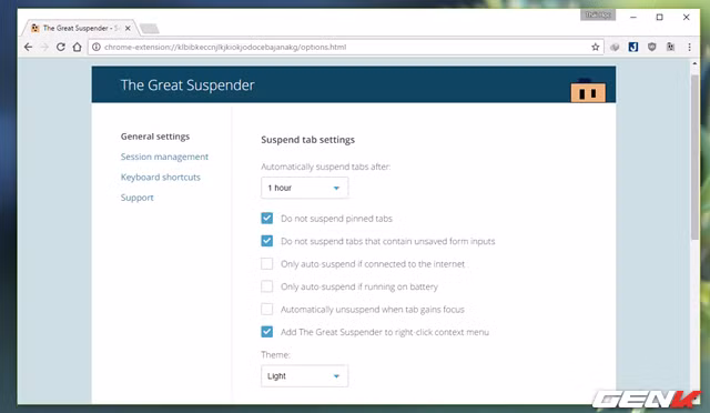 The Great Suspender có chức năng tự động đưa các tab không sử dụng trong khoảng thời gian từ 20 phút đến…3 ngày vào trạng thái “ngủ” để dồn và phân chia dung lượng bộ nhớ của các tab này vào các tab đang mở. Chính vì lẽ đó, bạn có thể giữ cho các tab đang truy cập các dịch vụ như Facebook, Gmail,… mở trong nền mà không phải lo sợ về việc giảm hiệu suất hoạt động của máy tính. Và bạn có thể nhanh chóng truy cập lại khi bất cứ khi nào mình muốn.