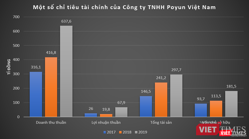 Về kết quả kinh doanh, dữ liệu của VietTimes cho thấy, trong giai đoạn 2017 – 2019, Poyun Việt Nam ghi nhận doanh thu tăng trưởng mạnh. Năm 2017 và 2018, doanh thu thuần của công ty này đạt lần lượt 316 tỉ đồng và 416,8 tỉ đồng, lãi thuần tương ứng ở mức 26 tỉ đồng và 19,8 tỉ đồng.