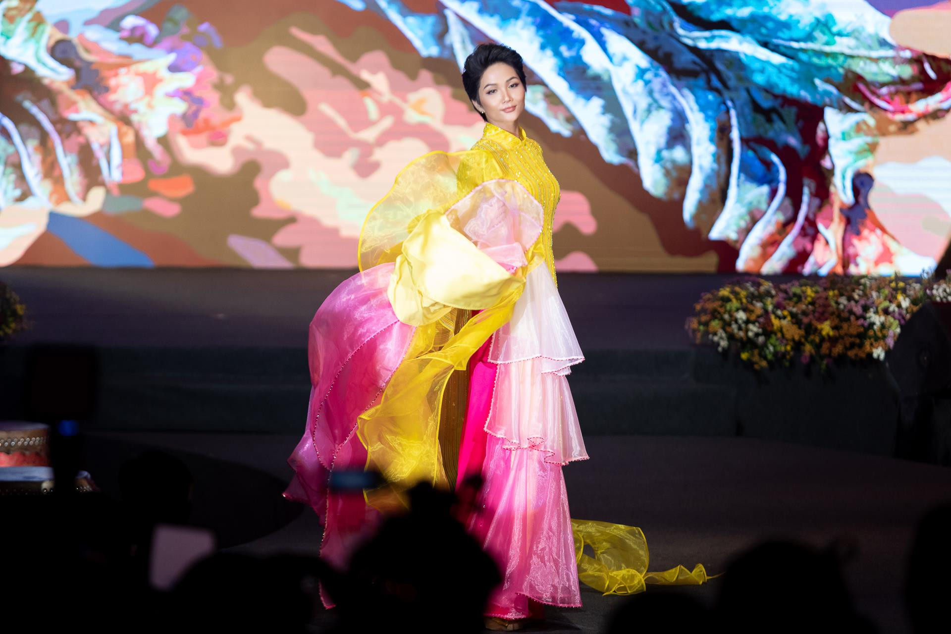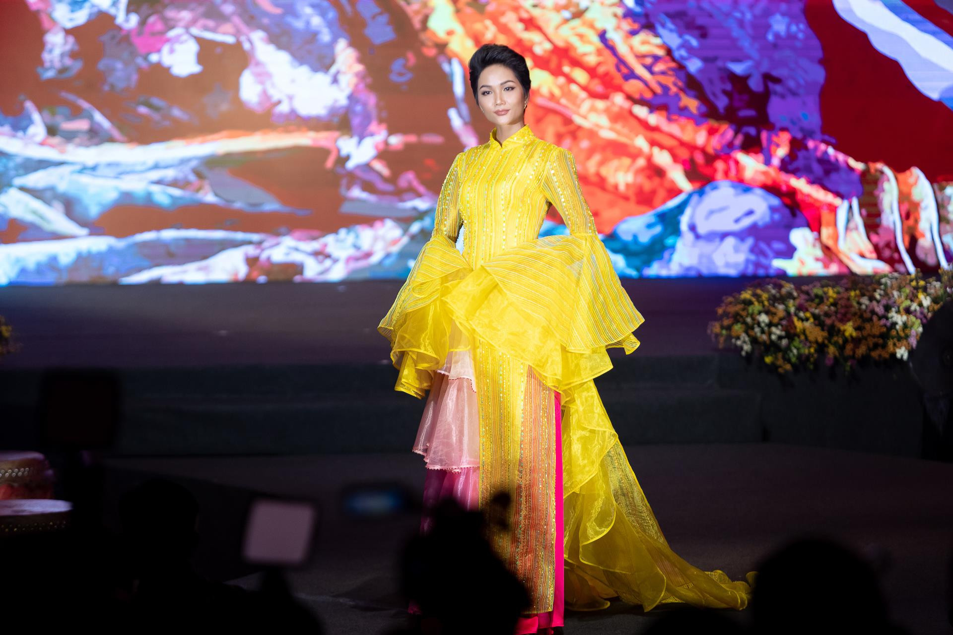 Xuất hiện trên sân khấu, Hoa hậu H’Hen Niê tạo sự bất ngờ cho khán giả khi cô trở lại hình ảnh đẹp lộng lẫy quen thuộc trong bộ áo dài cách tân của nhà thiết kế Thủy Nguyễn.