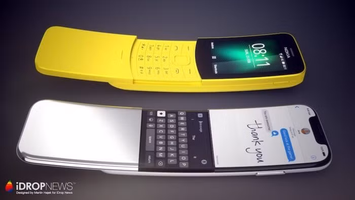 Và đúng như cảm hứng từ Nokia 8100, chiếc iPhone màn hình cong có hình dạng y hệt một quả chuối. Máy có thân hình dẹt và khả năng trượt để lộ màn hình hiển thị thứ hai bên dưới. Màn hình này có thể kiêm nhiều nhiệm vụ trong đó có bàn phím ảo để nhập văn bản. Thú vị hơn, iPhone "quả chuối" còn có tới hai logo ở cả trước và sau.