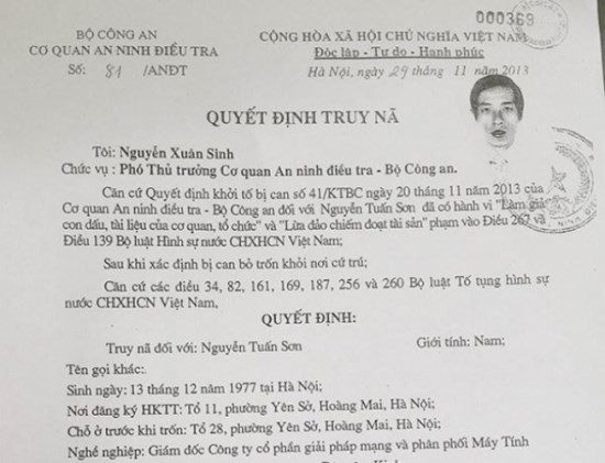 Cơ quan An ninh điều tra ra quyết định truy nã đối với Nguyễn Tuấn Sơn.