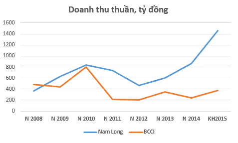 Trong giai đoạn 2008 – 2014, ngoại trừ năm 2008 doanh thu thuần của BCCI lớn hơn Nam Long, trong 5 năm còn lại Nam Long luôn có mức doanh thu lớn hơn BCCI, và từ năm 2012 dù cho thị trường bất động sản khó khăn Nam Long vẫn duy trì được tăng trưởng doanh thu.