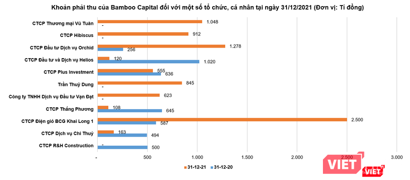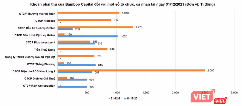 Trong đó, có thể kể tới khoản phải thu 1.047,9 tỉ đồng với Vũ Tuân được CTCP Bamboo Capital (Mã CK: BCG) ghi nhận tính đến ngày 31/12/2021.
