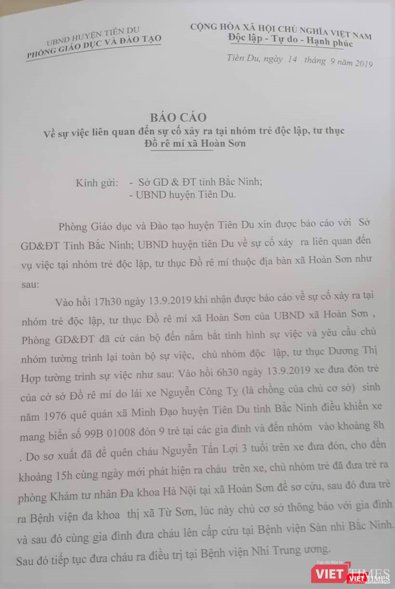 | Báo cáo của Phòng GD&ĐT huyện Tiên Du về vụ việc bỏ quên trẻ 3 tuổi trên xe ô tô đưa đón |