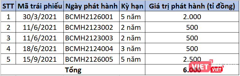 Riêng trong tháng 6/2021, Becamex IDC đã phát hành 3 lô trái phiếu lần lượt có mã BCMH2123002 (500 tỉ đồng), BCMH2123003 (500 tỉ đồng) và BCMH2124004 (500 tỉ đồng).