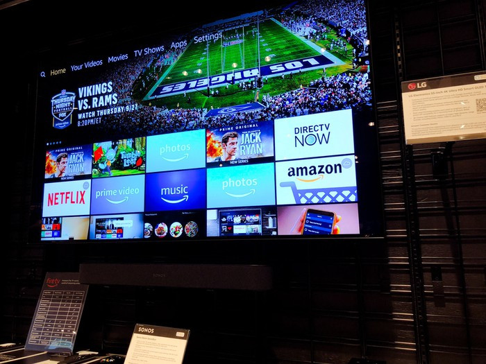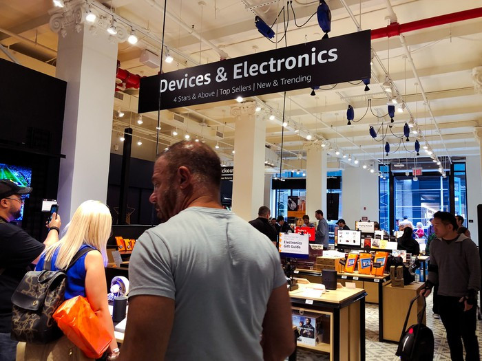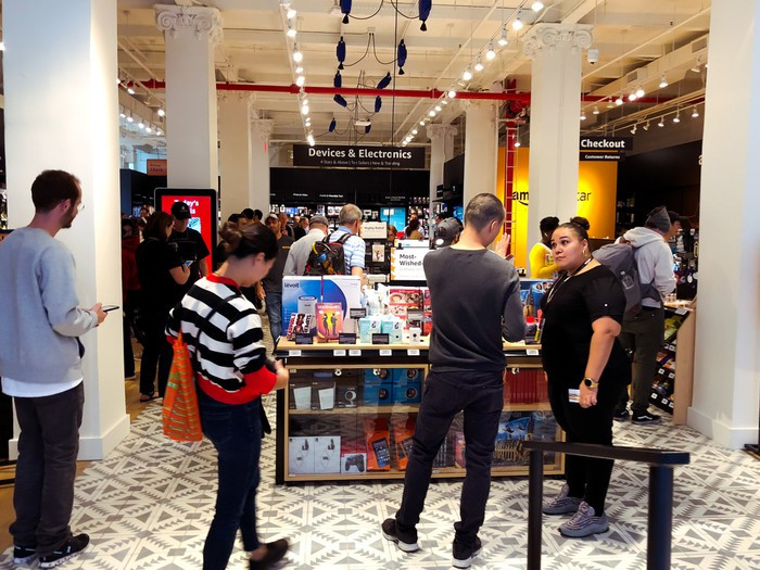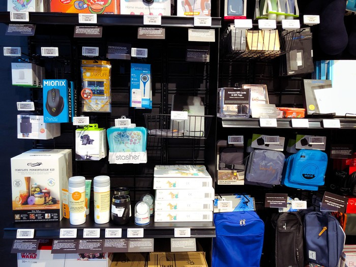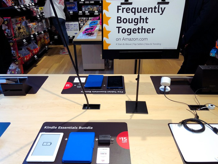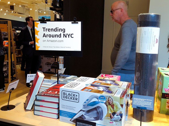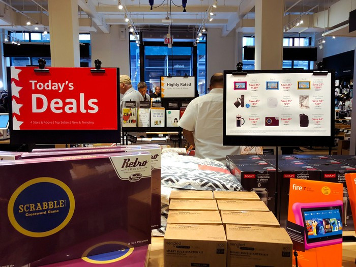 Các kệ hàng được phân loại giống như trên website của Amazon với các mục như "quà tặng cho thú cưng", "nến và trang trí nhà cửa", "Món đồ của ngày", "Thiết bị điện tử".