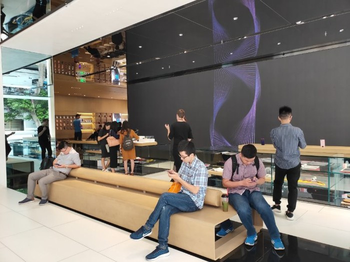 Các smartphone cao cấp của hãng được đặt 2 bên cửa hàng theo hàng dọc, và một dãy smartphone khác được đặt sát tường phía cuối cùng với tai nghe bố trí ở trên để người dùng trải nghiệm.