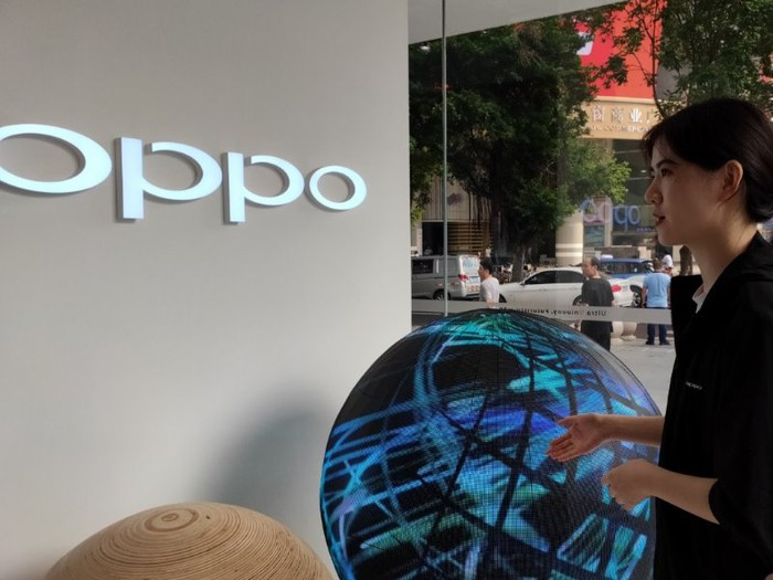 Bước vào cửa hàng người dùng sẽ thấy một quả địa cầu bằng màn hình LED, trên đó là bản đồ các nước mà Oppo có mặt trên thế giới.