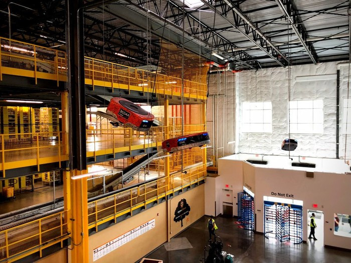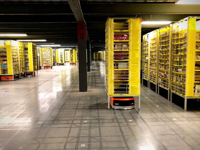 Một trong những thứ đầu tiên đập vào mắt khi bước vào Kent - tên kho hàng, là các robot tự động chuyển hàng treo trên trần nhà. Những robot này được vận hành bởi nhân viên Amazon từ những ngày đầu tiên kho hàng này hoạt động.