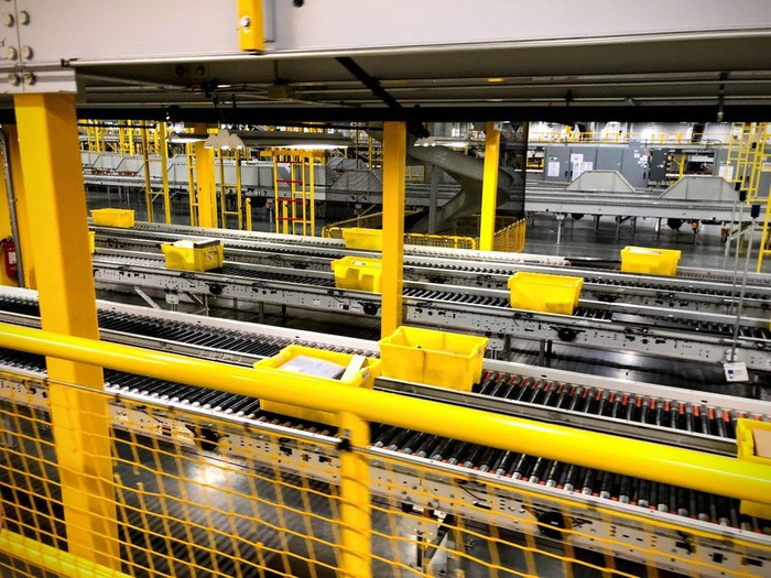 Vật phẩm được bỏ vào thùng một cách ngẫu nhiên không theo loại sản phẩm hoặc nhà cung cấp. Amazon nói điều này giúp đẩy nhanh tốc độ công việc do các kho bãi lớn như Kent có rất nhiều trạm phân loại hàng hóa. Bên trong một vài thùng chứa mọi thứ từ tã, dụng cụ môn bóng đá và cả một lốc bia Kombucha.