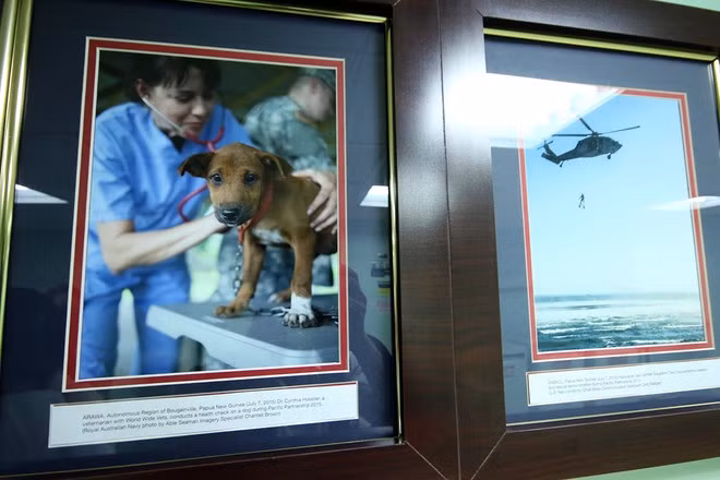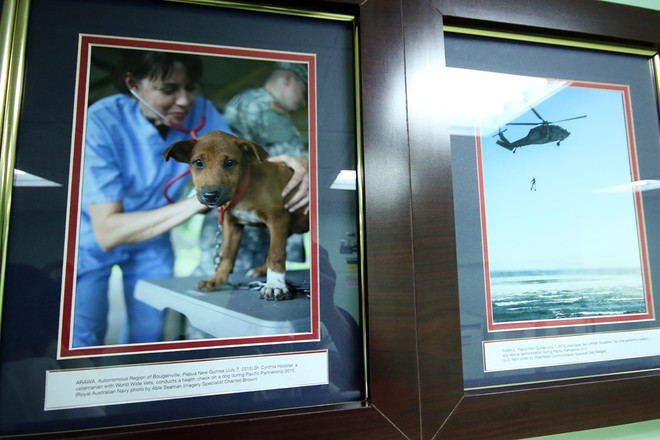 Dọc hành lang các tầng của tàu bệnh viện này trưng bày hình ảnh về các hoạt động thường niên. Bức ảnh một chú chó được chăm sóc y tế khiến nhiều người xúc động.