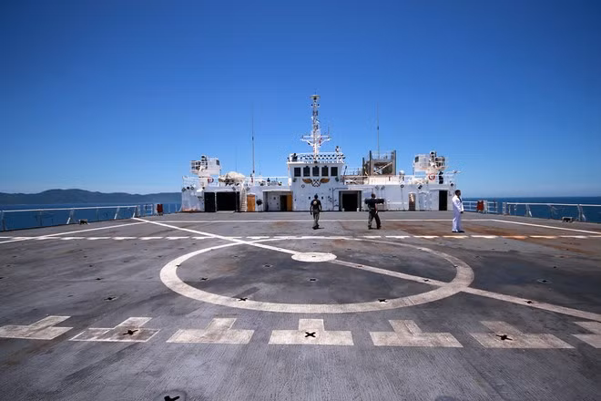 Sau buổi họp báo tại cầu cảng, báo giới cùng lãnh đạo sở, ngành ở Đà Nẵng di chuyển bằng tàu SAR của Trung tâm phối hợp tìm kiếm cứu nạn hàng hải khu vực 2 ra tham quan tàu bệnh viện Mercy.