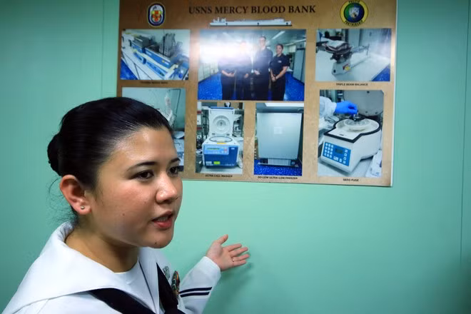 Một nhân viên y tế giới thiệu về ngân hàng máu sống được xây dựng suốt 10 năm qua trên tàu Mercy. Đây là nguồn máu dự trữ cần thiết và phát huy tác dụng trong nhiều trường hợp cấp cứu.