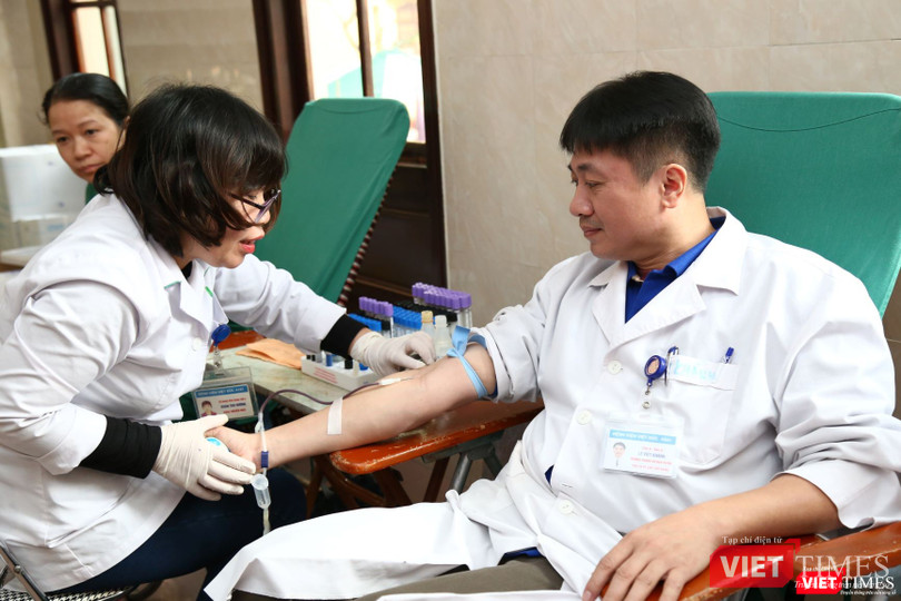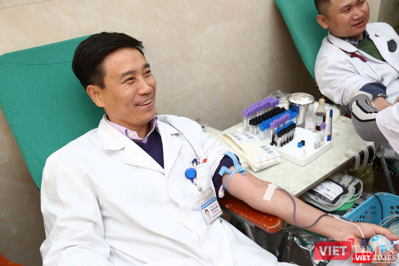 | PGS.TS. Đoàn Quốc Hưng - Phó Hiệu trường Trường Đại học Y Hà Nội và các thầy thuốc của Bệnh viện Hữu nghị Việt Đức tham gia hiến máu phục vụ điều trị |