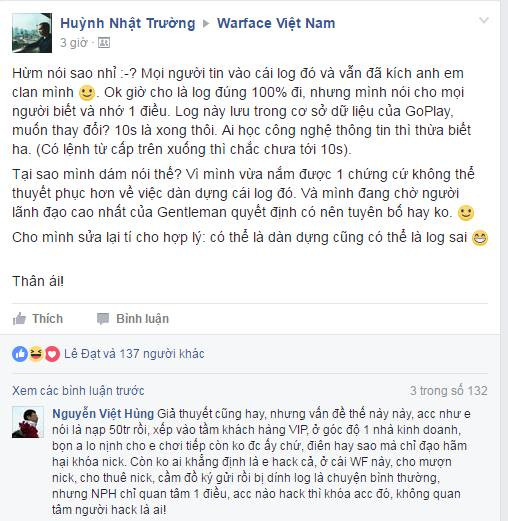 Dẫu vậy, ngay sau đó NPH GoPlay đã lên tiếng phản hồi lại về trường hợp này. Ông Nguyễn Việt Hùng - Giám đốc sản phẩm Warface tại NPH GoPlay đã lên tiếng khẳng định: "Giả thuyết cũng hay, nhưng vấn đề thế này này, acc như e nói là nạp 50tr rồi, xếp vào tầm khách hàng VIP, ở góc độ 1 nhà kinh doanh, bọn a lo nịnh cho e chơi tiếp còn ko đc ấy chứ, điên hay sao mà chỉ đạo hãm hại khóa nick. Còn ko ai khẳng định là e hack cả, ở cái WF này, cho mượn nick, cho thuê nick, cầm đồ ký gửi rồi bị dính log là chuyện bình thường, nhưng NPH chỉ quan tâm 1 điều, acc nào hack thì khóa acc đó, không quan tâm người hack là ai!"