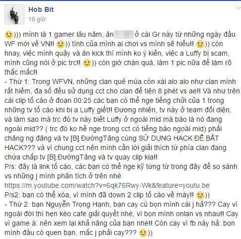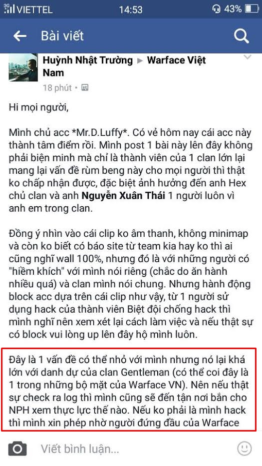 Game thủ D.Mr.Luffy lên tiếng: "Mình chủ acc *Mr.D.Luffy*. Có vẻ hôm nay cái acc này thành tâm điểm rồi. Mình post 1 bài này lên đây không phải biện minh mà chỉ là thành viên của 1 clan lớn lại mang lại vấn đề rùm beng này cho mọi người thì thật ko chấp nhận được, đặc biệt ảnh hưởng đến anh Hex chủ clan và anh Nguyễn Xuân Thái 1 người luôn vì anh em trong clan.