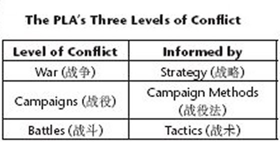 Lý luận cơ bản của PLA khẳng định 3 cấp độ của xung đột và những mô hình hoạt động tác chiến : Chiến tranh, chiến dịch và các trận chiến đấu. tương đương với các tư duy quân sự " Tư tưởng chiến lược, tư duy chiến dịch và các hình thức chiến thuật”.