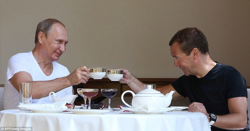 Thời gian cho trà: Chúc mừng cho thời gian làm việc thành công ở văn phòng, Putin và Medvedev thưởng thức một tách trà trước bữa sáng.