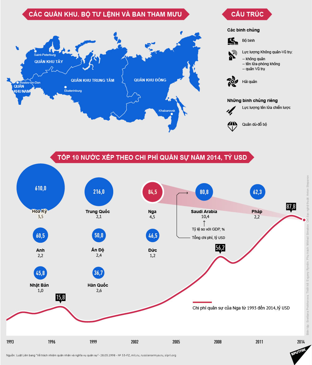 Như phương án xếp hạng của tạp chí Business Insider, theo các thông số chung quân đội Nga chiếm vị trí thứ 2 thế giới về hỏa lực chiến đấu (sau quân đội Hoa Kỳ) và vượt hơn tất cả các quân đội trên toàn thế giới về số lượng xe tăng và vũ khí hạt nhân.