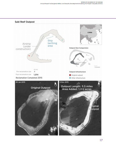 Đáng chú ý là, đây lần đầu tiên trong báo cáo hàng năm của Lầu Năm Góc đã đưa ra thông tin chi tiết như vậy, Trung Quốc đã tiến hành các hoạt động bồi đắp đảo nhân tạo vào tháng 12.2013. Bản báo cáo được công bố vào ngày 13.05, bao gồm bảy trang sơ đồ, hình ảnh của vệ tinh trinh sát chụp trước và sau các đảo nhân tạo và công trình.