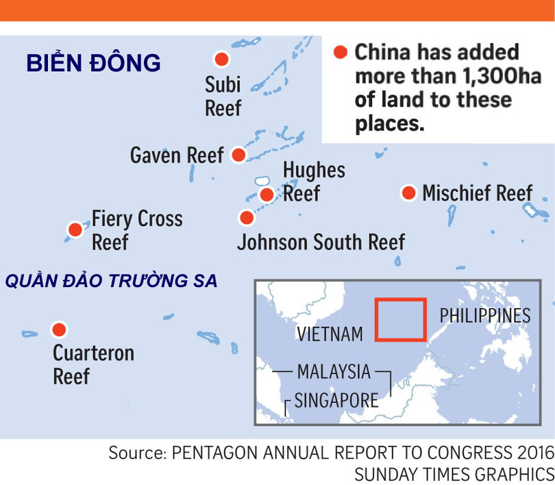 Trung Quốc đã bồi đắp 1.300 ha nhân tạo trên vùng nước quần đảo Trường Sa, sơ đồ báo cáo của Lầu Năm Góc