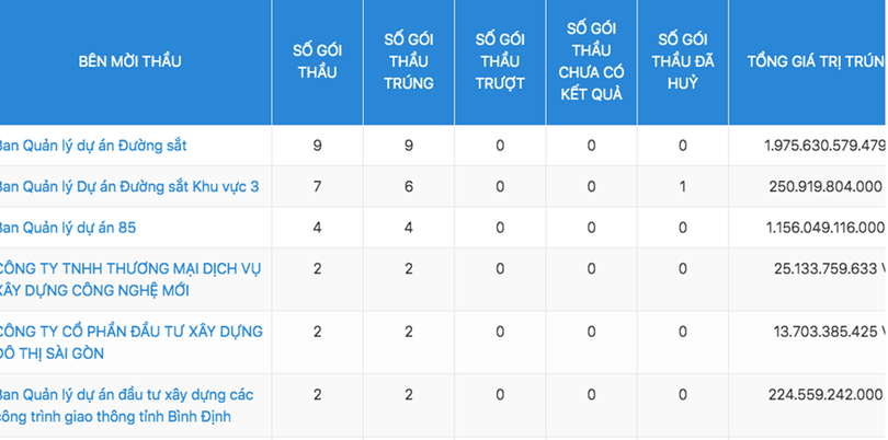 Trong đó, tổng giá trị trúng thầu với vai trò độc lập là hơn 108 tỷ đồng, còn tổng giá trị các gói thầu đã tham gia và trúng thầu với vai trò liên danh là hơn 6.570 tỷ đồng.
