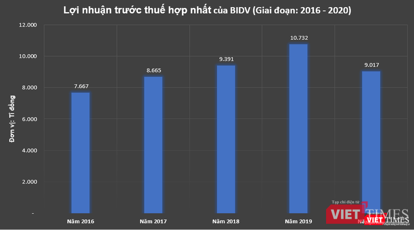 Như vậy, theo tính toán của VietTimes, BIDV đã hoàn thành 72% kế hoạch lợi nhuận trước thuế hợp nhất năm 2020. Kết quả kinh doanh hợp nhất trước thuế nêu trên cũng giảm 15,9% so với năm 2019.