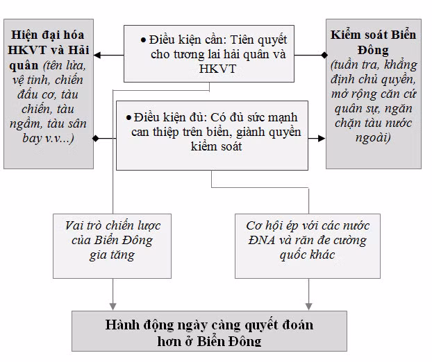 Việc kiểm soát Biển Đông đóng vai trò tiên quyết cho tương lai phát triển và hiện đại hóa của hải quân và ngành hàng không vũ trụ của Trung Quốc. Nói cách khác, vai trò chiến lược của Biển Đông đối với Trung Quốc đã gia tăng cùng với quá trình hiện đại hóa của quân đội nước này. Ngược lại, nhờ tăng cường sức mạnh hải - không quân và ngành hàng không vũ trụ, trong đó có quân sự vũ trụ, Trung Quốc đã tăng cường khả năng răn đe và kiểm soát trên biển. Điều đó cho phép Bắc Kinh quyết đoán hơn trong các tình huống căng thẳng trên Biển Đông.