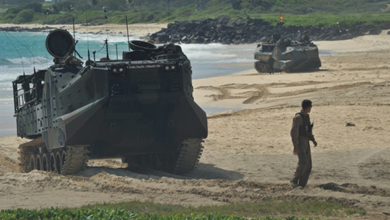 Binh sĩ Nhật Bản thuộc Trung đoàn bộ binh phia Tây diễn tập với lính thủy đánh bộ Mỹ tại Hawaii trong bài tập thực hành đổ bộ tấn công với xe thiết giáp lưỡng cư  AAV - 7A1, tháng 8.2014.