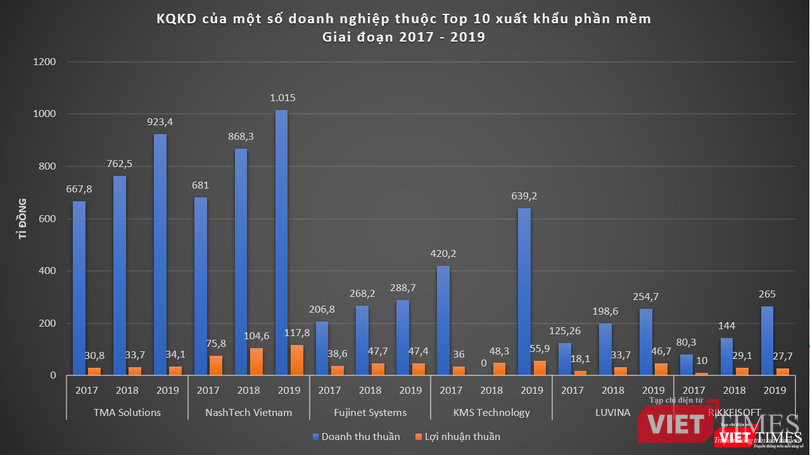 Dữ liệu của VietTimes cho thấy, trong giai đoạn 2017 - 2019, chỉ tiêu doanh thu thuần của các doanh nghiệp trên đều tăng trưởng qua các năm, tỷ suất sinh lời ở mức cao. Trong đó, nổi bật hơn cả là TMA Solutions và NashTech Vietnam.