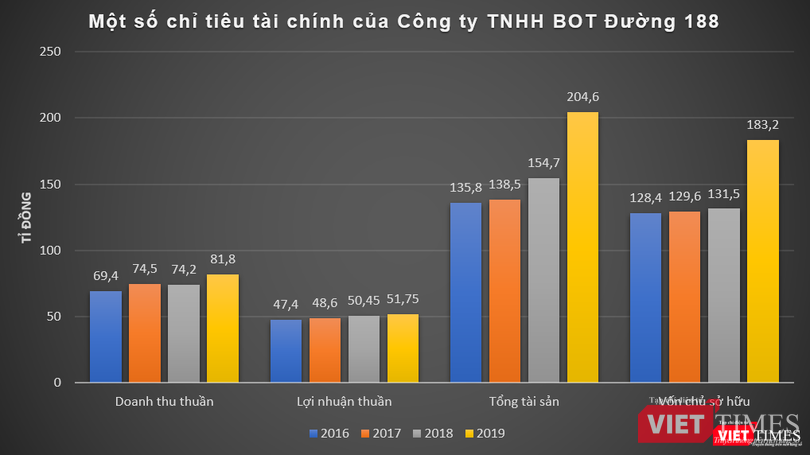 Gần nhất, năm 2019, doanh thu thuần của BOT 188 đạt 81,8 tỉ đồng, lãi thuần ở mức 51,75 tỉ đồng, tương ứng với biên lợi nhuận 63%.
