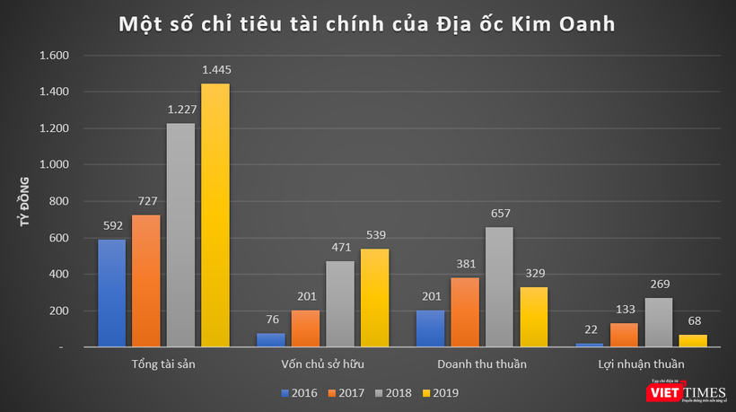 Trong giai đoạn 2016 – 2019, quy mô tổng tài sản của Địa ốc Kim Oanh tăng gấp 2,4 lần, từ 592 tỉ đồng (cuối năm 2016) lên mức 1.445 tỉ đồng (cuối năm 2019). Tương tự, quy mô vốn chủ sở hữu của công ty này cũng tăng nhanh, từ mức 76 tỉ đồng vào cuối năm 2016 lên mức 539 tỉ đồng vào cuối năm 2019.