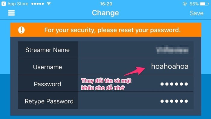 - Bước 2: Giao diện chính của AtHome Video Streamer khá đơn giản với màn hình camera, CID (định danh camera), Username (tên đăng nhập) và Password (mật khẩu) dùng để kết nối từ xa. Để dễ nhớ hơn, người dùng có thể chạm vào biểu tượng menu ở góc trên bên trái, sau đó nhấn Change và thay đổi lại tùy ý. Lưu ý, mật khẩu phải có độ dài tối thiểu từ 6 kí tự trở lên, bao gồm chữ thường, chữ hoa và số.
