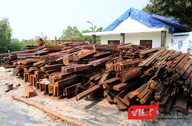 Tại hiện trường, hàng trăm khối gỗ quý là cột, dầm, mái của các ngôi nhà tại đây được tháo dỡ, đập phá, chất đống nằm la liệt khắp nơi. Một số tài sản quý được che phủ bạt, số còn lại chất đống ngổn ngang, phơi cùng mưa nắng.