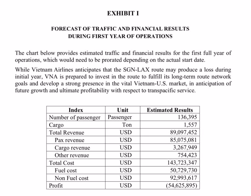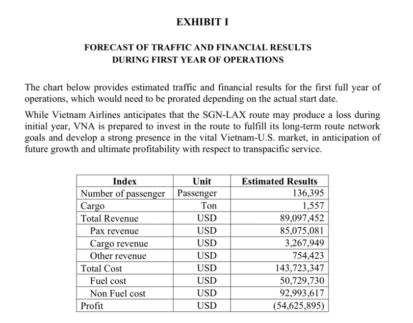 Vào tháng 3.2019, trong đơn gửi tới Bộ Giao thông vận tải Hoa Kỳ, Vietnam Airlines ước tính lượng chuyên chở và tài chính cho các hoạt động trong năm đầu tiên của tuyến bay đề xuất tới Los Angeles (LAX). Mặc dù dự kiến sẽ lỗ tới 54 triệu USD, Vietnam Airlines nhấn mạnh sự ủng hộ đối với thị trường, tuyên bố:
