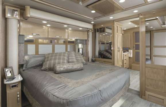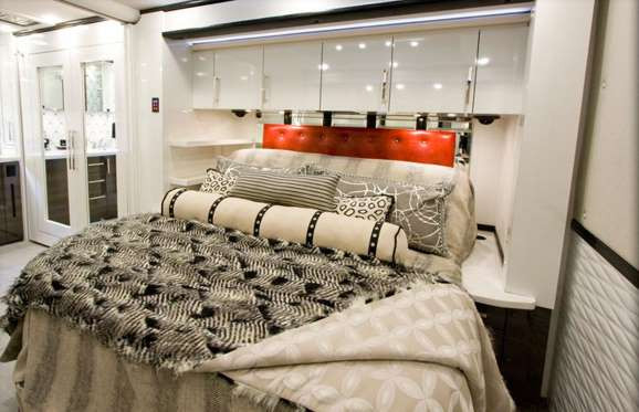 Có được giấc ngủ ngon lành trên đường dài là phần quan trọng của chiếc RV sang trọng này. Phòng ngủ sang trọng được trang hoàng bằng chiếc giường King size lớn đặt nệm Eassy Slumber và bộ đồ giường theo kích thước yêu cầu của khách hàng.