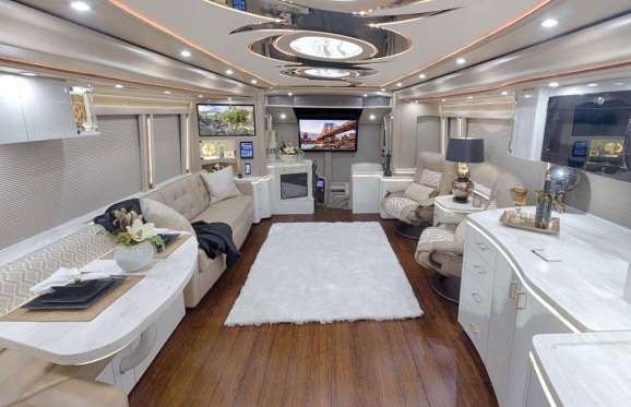 Để tái tạo lại cảm giác ấm áp tương tự như trong một ngôi nhà thực sự, dòng xe Marathon 2017 Prevost motorhome có lò sưởi giả có lửa điện tử ở phòng salon chính mà chủ sở hữu và khách có thể ngồi xung quanh trò chuyện.