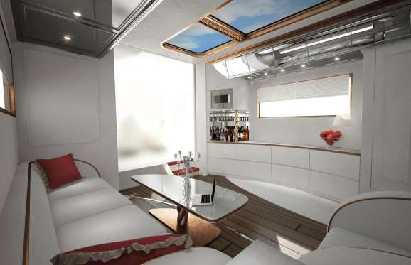 Phòng salon chính có gam màu chủ đạo màu trắng và viền vàng gây ấn tượng nghiêm túc với cửa sổ trên mái rất lớn, tạo cảm giác tự do, có thể được dán lớp kính màu đen bên ngoài để bảo mật tối ưu trong thùng xe, một quầy bar cocktail sang trọng và một lò sưởi đầy đủ chức năng, ghế ngồi bọc da mềm mại và một TV 40 inch 4K.
