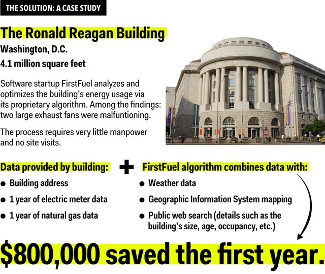 Trong hơn 36000 tòa nhà kể trên thì nổi bật nhất là Trung tâm thương mai quốc tế Ronald Reagan tại thủ đô Washington DC. Ngay ngày đầu tiên FirstFuel áp dụng các thuật toán để tính hiệu suất năng lượng thì họ đã phát hiện biểu đồ năng lượng tiêu thụ của tòa nhà này cao đột biến trong khoảng thời gian từ 10 sáng đến 3 giờ chiều.