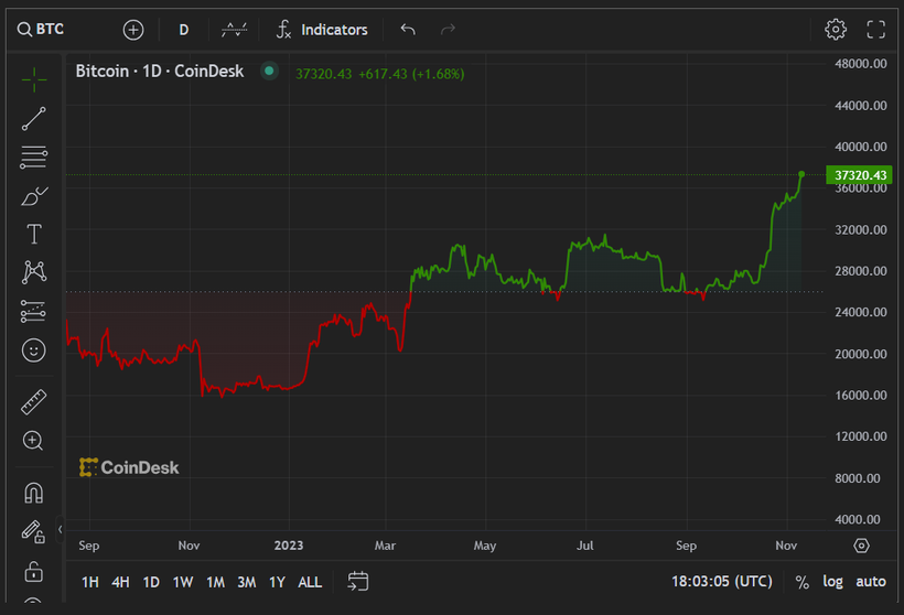 Theo dữ liệu của CoinDesk, cập nhật tới 1h00 ngày 12/11, giá Bitcoin giao dịch ở mức 37.126,4 USD/BTC, tương ứng với mức vốn hóa 725,4 tỉ USD.