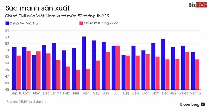Chỉ số nhà quản trị mua hàng sản xuất của Việt Nam liên tục vượt mức 50 điểm kể từ tháng 8/2013, theo số liệu của ngân hàng HSBC và Markit Economics.