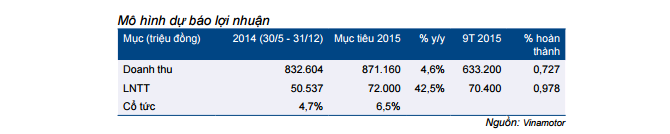 Theo ước tính của CTCP Chứng khoán TP.HCM (HSC), doanh thu và lợi nhuận trước thuế của Vinamotor sẽ vượt kế hoạch cả năm, doanh thu tăng 4,6%, tương ứng thu về 871 tỷ đồng và lợi nhuận trước thuế tăng mạnh 42%, tương đương 72 tỷ đồng so với năm 2014.