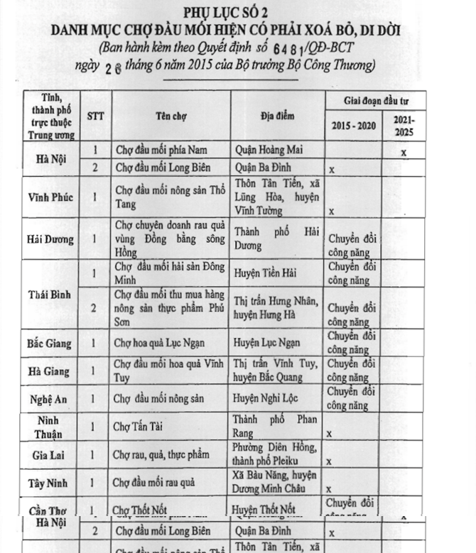 Theo đó, Bộ Công thương cho biết chợ đầu mối Long Biên (Ba Đình) và chợ đầu mối phía Nam (Hoàng Mai) thuộc danh sách “Danh mục chợ đầu mối hiện có phải xoá bỏ, di dời”. Danh mục này đánh dấu “x”phần nội dung “giai đoạn đầu tư” từ năm 2015-2020 đối với chợ đầu mối Long Biên và giai 2021-2025 đối với chợ đầu mối phía Nam.