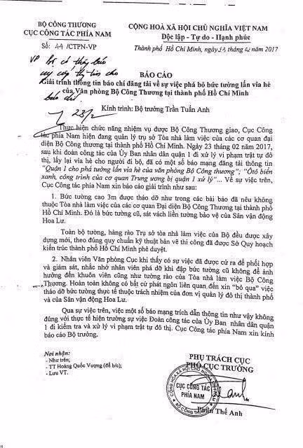 Chiều 23.2, Cục Công tác phía Nam của Bộ Công Thương đã có báo cáo giải trình thông tin báo chí đăng tải về việc phá bỏ bức tường lấn chiếm vỉa hè của Văn phòng Bộ Công Thương tại TP.HCM.